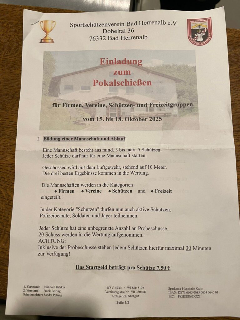 Mittwoch lädt der Sportschützenverein Bad Herrenalb wieder zum beliebten Pokalschießen 2025 ein. Zahlreiche Vereine, Firmen, Stammtische und Freizeitgruppen aus der Region werden erwartet, um in geselliger Atmosphäre ihre Treffsicherheit unter Beweis zu stellen und um die begehrten Pokale zu kämpfen.